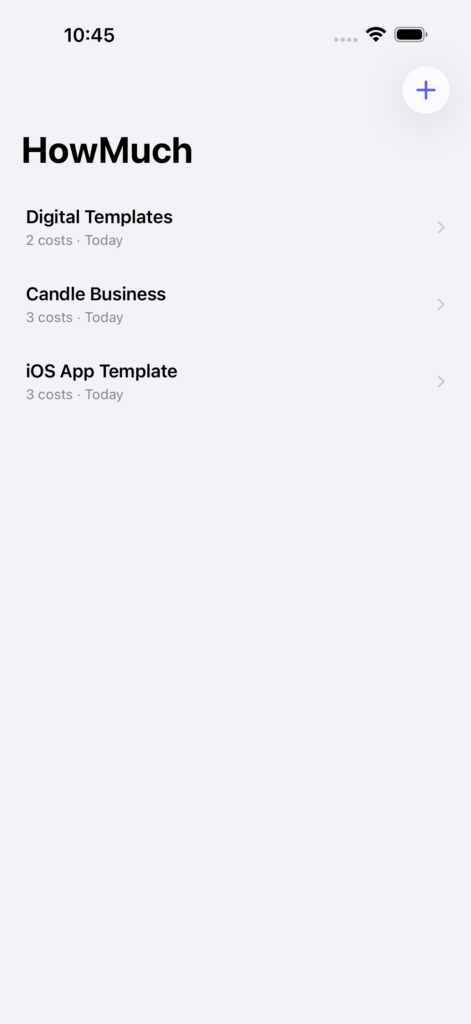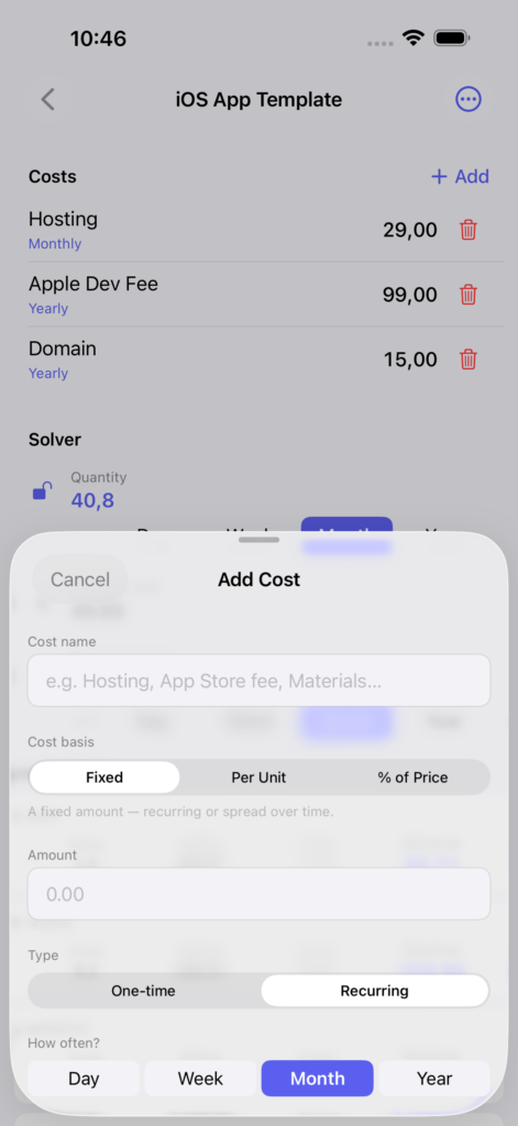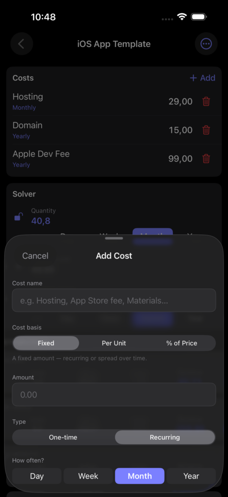 Flexible costs. Mix one-time and recurring costs with any cadence — daily, weekly, monthly, or yearly. HowMuch normalises everything automatically.