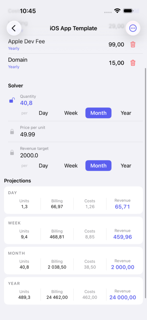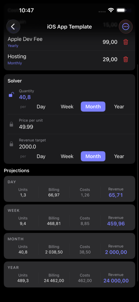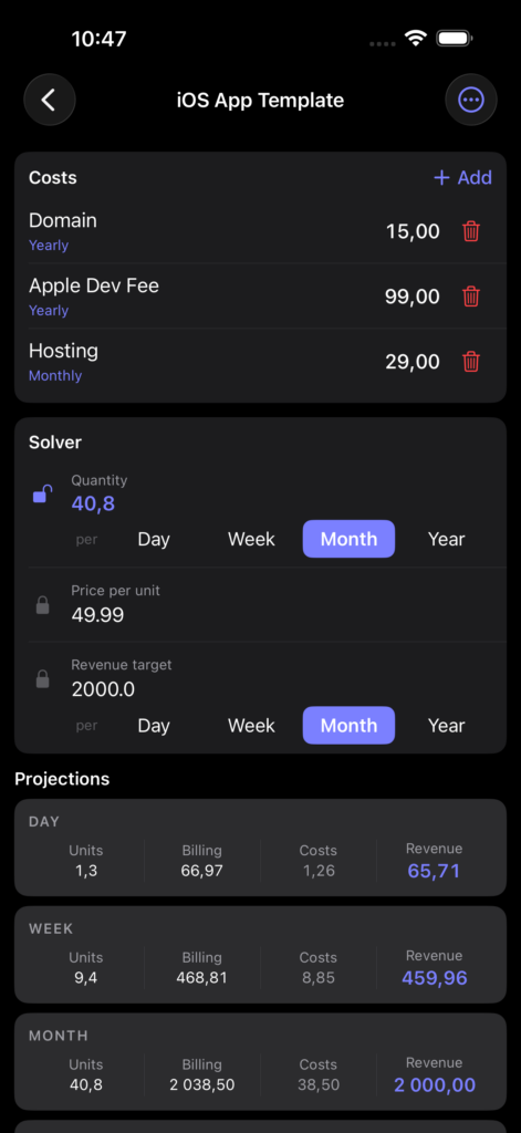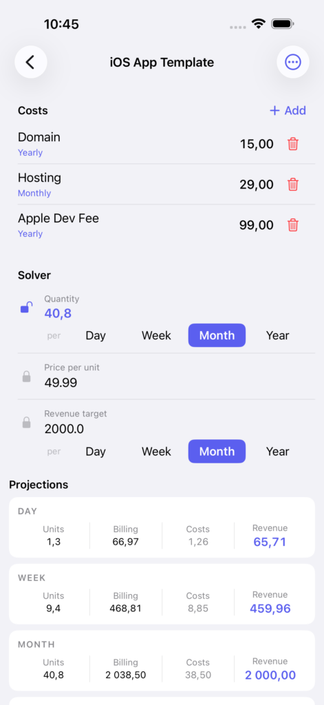 HowMuch replaces the spreadsheet. Enter your costs, pick what you want to solve for, and get instant projections across every time window at once.